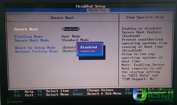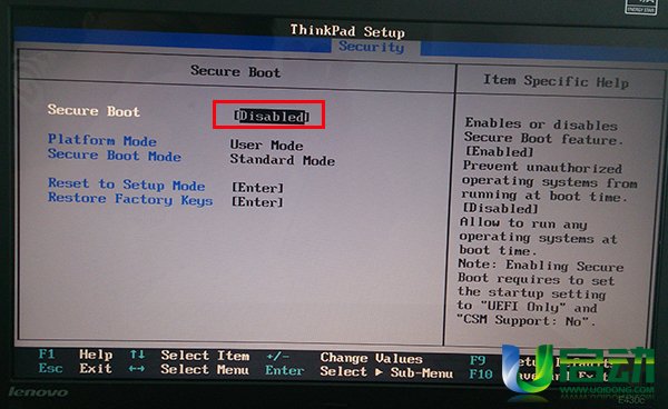 5、完成上面的操作后,secure boot的属性就修改为“disabled”,然后按esc键返回上一步,如下图所示: