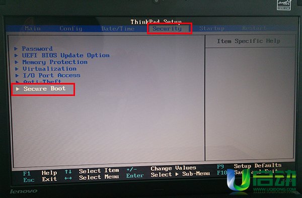 2、使用键盘上的左右方向键将光标移至“security”栏目,再使用上下方向键将光标移至“secure boot”选项,按回车键执行,如下图所示: