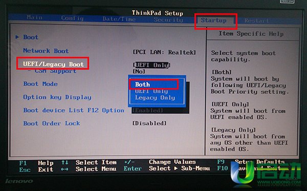 6、接着使用左右方向键将光标移至“startup”栏目,再使用上下方向键将光标移至“uefi/legacy boot”选项,按回车键,在弹出的选择窗口中,使用上下方向键将光标移至“both”选项,按回车键确认,如下图所示: